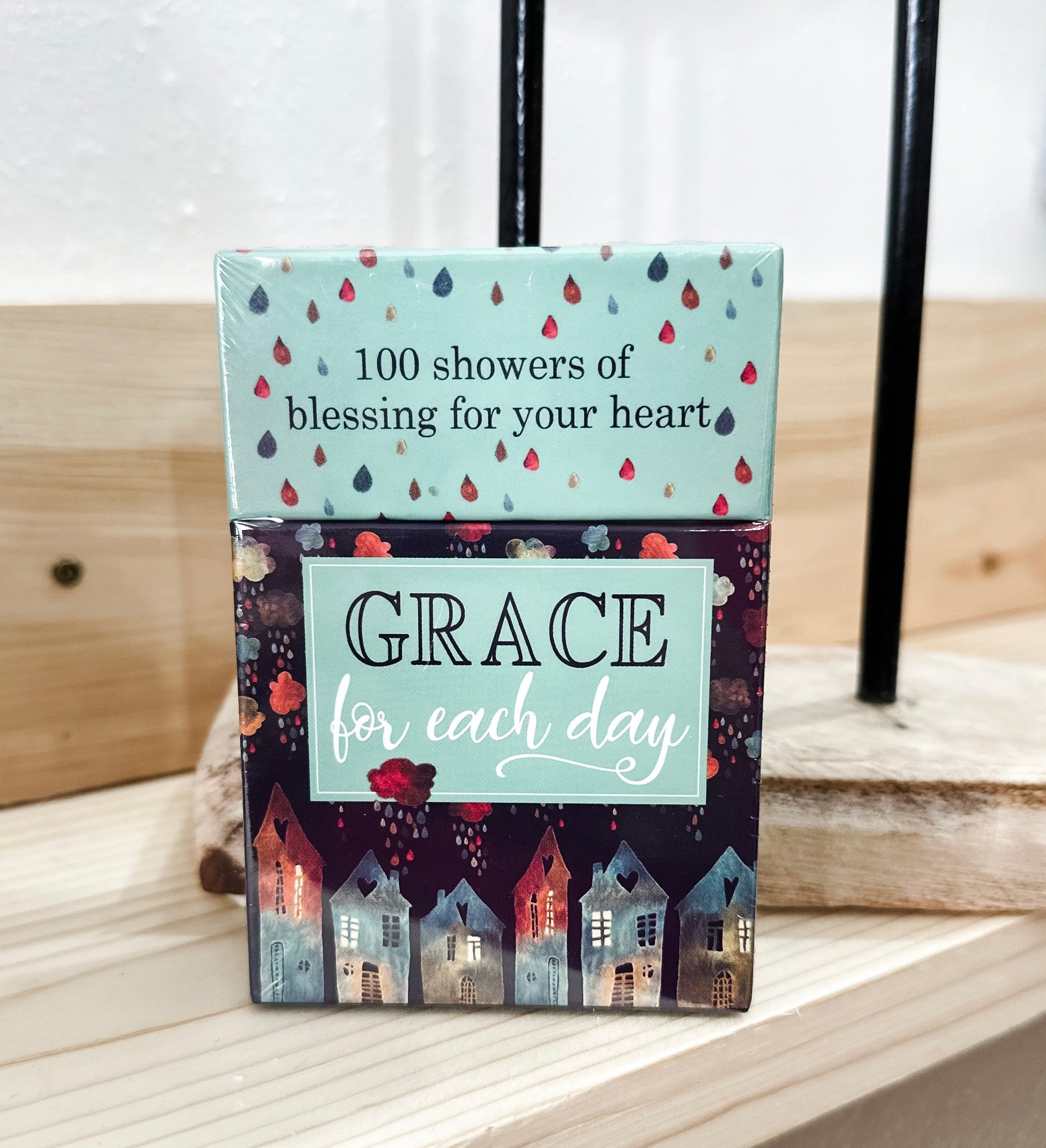 The Grace for Each Day Box of Blessings is a little box filled with cards that will turn your focus to the beautiful blessings in your life and help you to meditate on inspirational Scripture verses. It is also a handy way to share your gratitude and God's grace with a friend by simply writing a sweet message on the back of one of the cards. The cards are held in a box with a tight-fitting teal lid that seals the box and displays colorful raindrops. The artistically designed body of the box shows friendly watercolor houses with colorful clouds above them that pour down raindrops against a dark blue background. A teal rectangle at the center of the design holds the multi-color, multi-font title. Grace for each day The 50 double-sided cards will go a long way to cultivate a heart of gratitude as you meditate on the specially selected Scripture verses organized around the themes of grace and thankfulness.